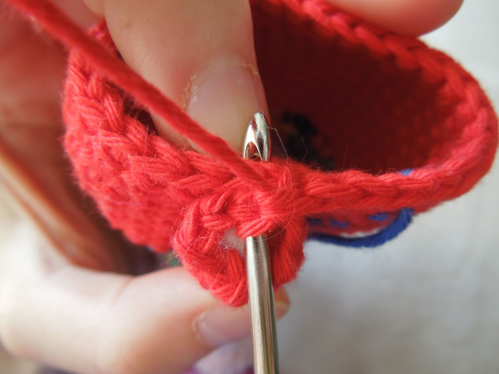 Nun den Faden wieder zum Hinterkopf stechen und knapp abschneiden. Wenn noch etwas von dem Kontrastgarn zu sehen ist, einfach mit der Rückseite des Häkelhakens in den Kopf schieben, dann hat sich das auch erledigt.