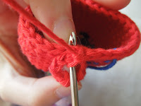 4. Reihe: 1. Masche verdoppeln - 1fm - 4er bob - nächste Masche verdoppeln - 1fm - mit weiß 4er bob -